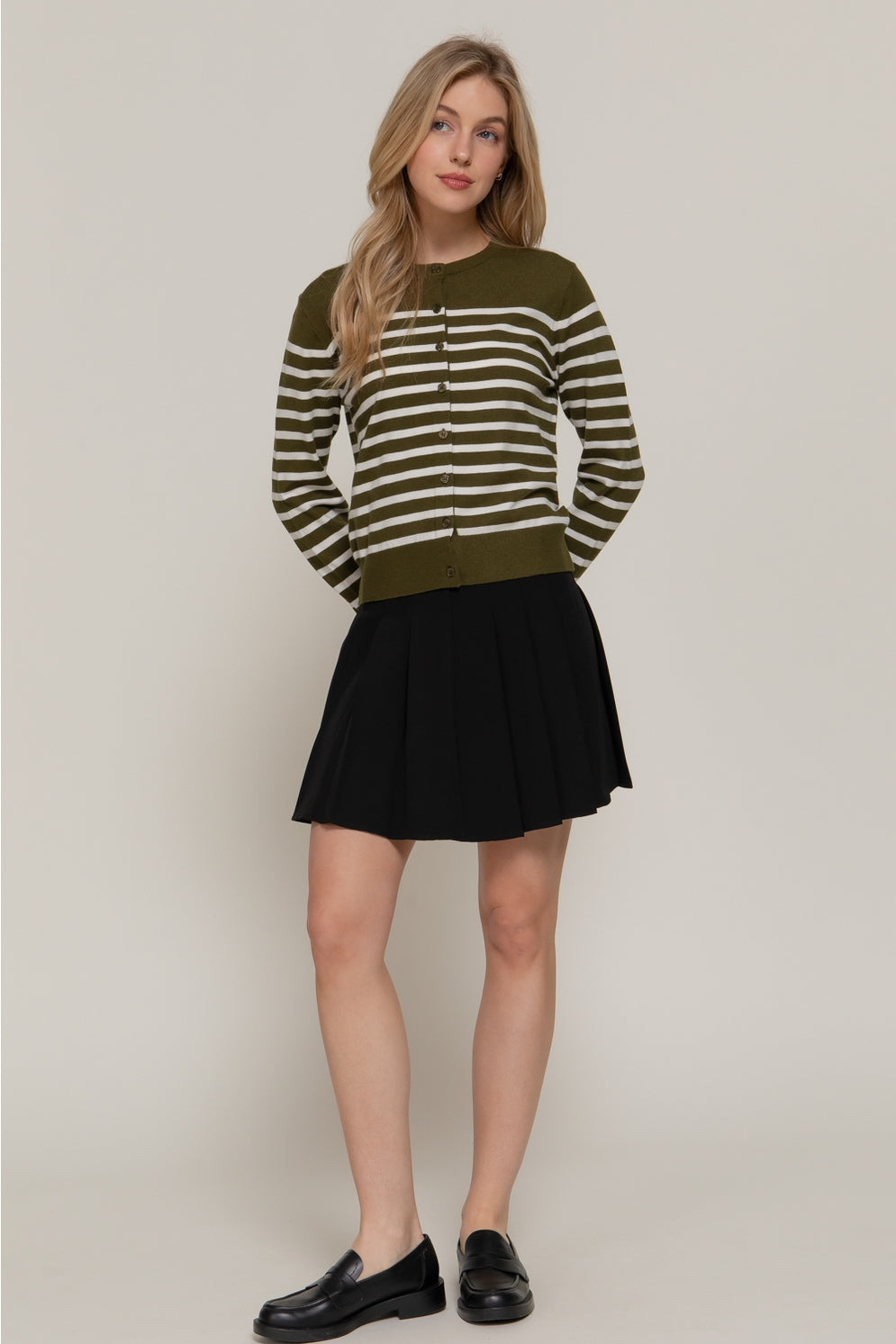 Crew neck button-up cardigan with olive and cream stripes.